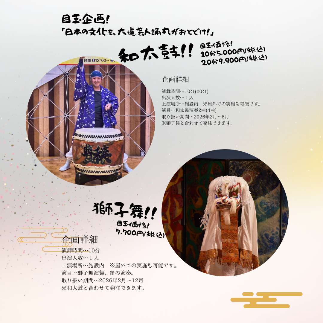 ■「竹」22,000円…太鼓、獅子舞、音楽の生演奏、歌、落語
